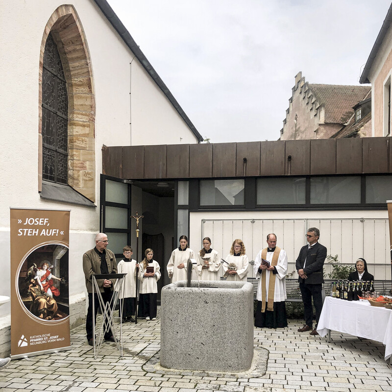 Anlässlich des Abschlusses der Arbeiten an der Freiraumgestaltung im Bereich Im Berg, zwischen Stadtpfarrkirche St. Josef und Pfarrhof konnte am 27.07.25 der neue Brunnen feierlich gesegnet werden. Im Beisein vieler Gemeindemitglieder und Vertreter der Stadt Neunburg vorm Wald galt der Dank den Beteiligten Entscheidungsträgern, Planern und Handwerksfirmen, sowie der Städtebauförderung bei der Regierung der Oberpfalz.