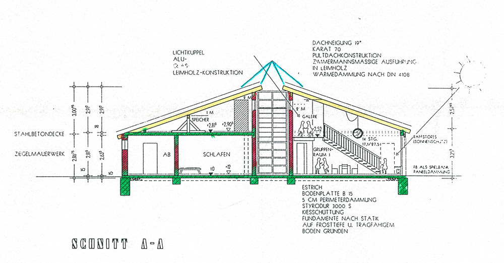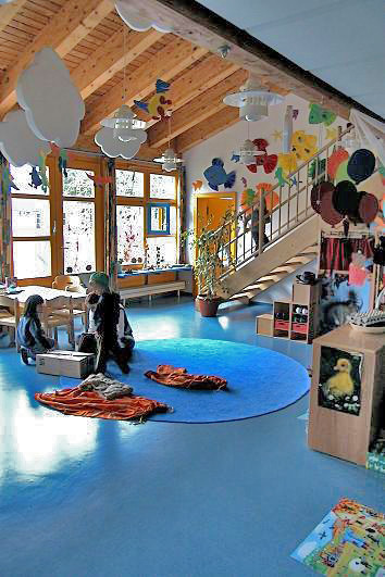 Durch den in der Mitte gesprengten Baukörper entstehen nicht nur lichtduchflutete Räume, sondern auch eine Gliederung des Volumens. Ebenso generierte sich eine helle Empfangshalle, in die der Besucher nach Betreten des Kindergartens gelenkt wird. Die Anordnung der Gruppenräume und die Orientierung zum südlich gelegenen Garten sorgt für den richtigen Ausblick in das Grün und gute Belichtung am Tag. Nebenräume wurden nach Norden hin oder in die Mitte positioniert. Das raumhaltige Dach und eingeschobene Galerien bieten den Kindern großzügigen Freiraum und Platz für Aktivität und Entfaltung.