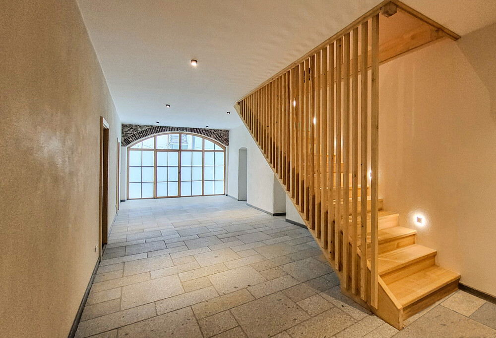 Nach dem Umbau soll das Gebäude grunsätzlich über den Garten erschlossen werden. Über eine Stube mit Eckbank betritt man das Gebäude. Hier gelangt man in hauswirtschaftlich genutzte Seitenräume, das Büro und ein Gäste-WC, wie auch in die große Halle, in welcher eine Treppe nach oben führt. Die ehemaligen erdgeschossigen Wohnräume werden zu einer separaten Wohnung mit eigenem Zugang über den Garten umgebaut. Zusätzlich befinden sich noch weitere Stauräume an der Seite zur Eingangshalle. Auch zum Keller kommt man hier.